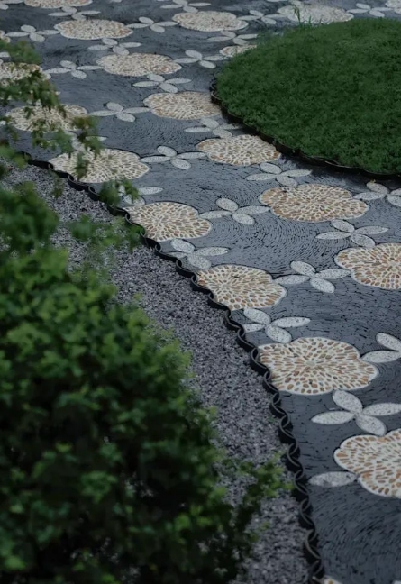 注意:在鋪裝施工時要做好收邊,散置卵石難免會出現卵石出逃的情況哦!