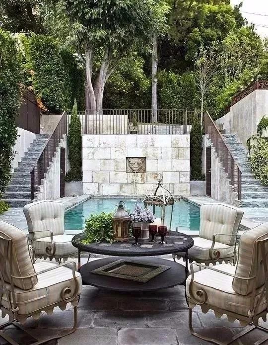 修剪整齊的灌木和紀念噴泉,搭配花籬、小徑、供小鳥戲水的柱盆、花草容器等景觀裝飾物,隨處可見的木質(zhì)椅子、石質(zhì)地面,以及一整套色彩清新、使用舒適的家具,讓歐式庭院中的景觀自然而和諧,把庭院布置地如同大自然中無法分割的一部分。