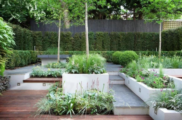 第三步通過防腐木地臺與地磚鋪設通過臺階式設計,用小葉黃楊與鵝軟石弱化邊緣的生硬感,功能劃分一目了然,整體簡潔耐看,細節(jié)打造可見用心;臺階與花池一起打造,用材上也一致 選用白水泥飾面,地面淺灰磚鋪設,清一色的綠植 高低錯落,色調統(tǒng)一,樣式簡單但有變化,以景觀為主的院子這樣打造再好不過。用白色水泥花池做出高低層次,綠植也是用高、中、低搭配,再加上地面鋪裝中點綴的綠植,這不是構成里的有序中的無序嗎?