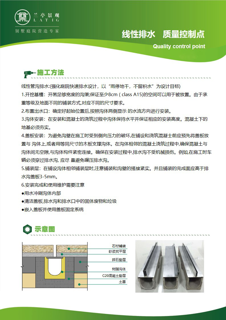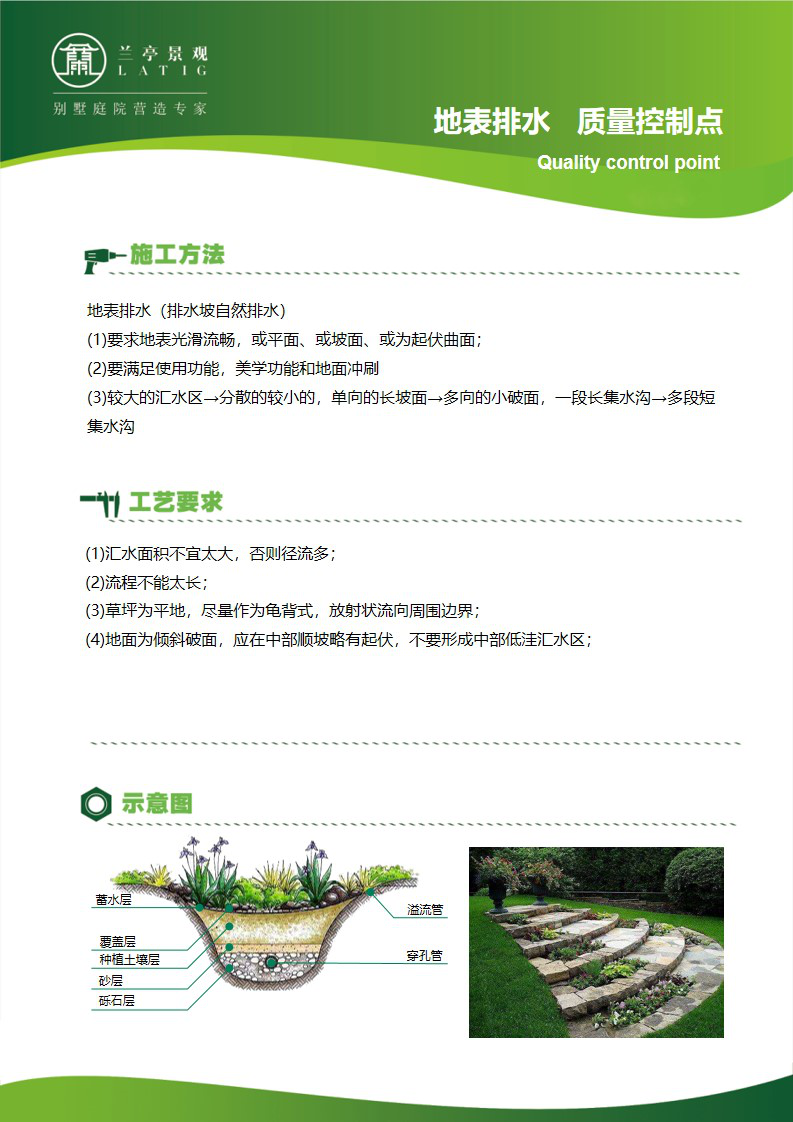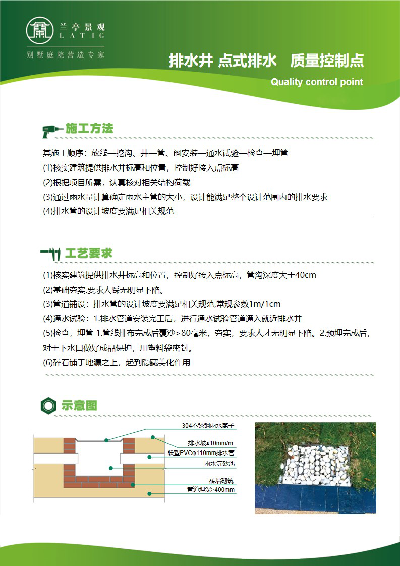 蘭亭景觀引進(jìn)了專業(yè)水電工程設(shè)計(jì),強(qiáng)化了庭院快速排水設(shè)計(jì),以“雨停地干,不留積水”為設(shè)計(jì)目標(biāo),制定了非常詳細(xì)的《繪綠園林快速排水設(shè)計(jì)規(guī)范》,設(shè)計(jì)標(biāo)準(zhǔn)滿足降水量達(dá)到50毫米以上的暴雨環(huán)境。