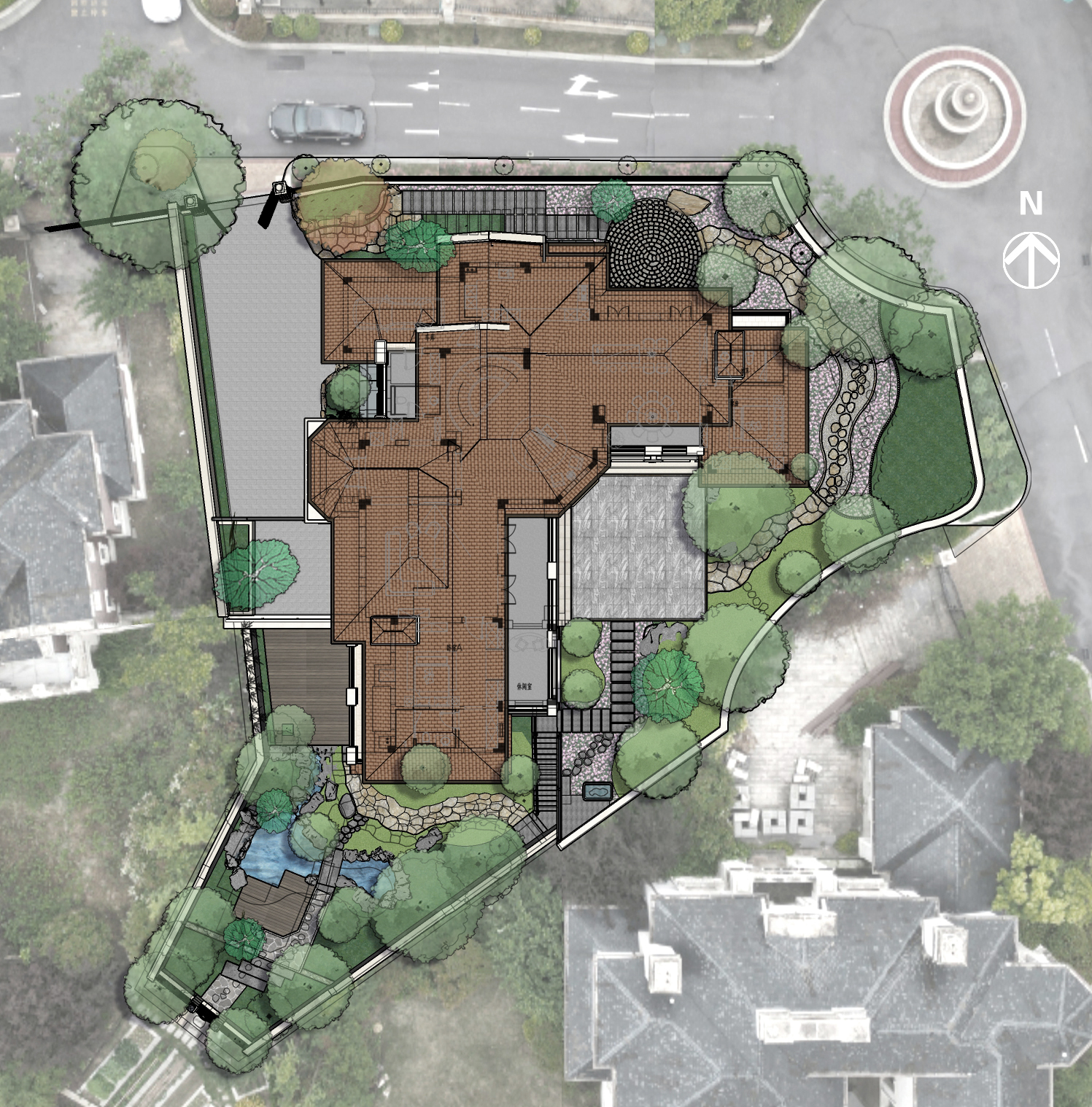 項目坐落于青島少海湖風(fēng)景區(qū)之中,湖景環(huán)抱整個別墅區(qū),環(huán)境優(yōu)美,項目的花園高低不同,分上下兩層??捎^賞湖景的水色風(fēng)光,亦可沉浸在美麗花園之中。在接手設(shè)計時的花園并不令人滿意,上層入口的大面積都在下層茶室的頂板之上,導(dǎo)致了該面積區(qū)域都是簡單的鋪裝,其他區(qū)域的植物雜亂無序,缺乏美感。在與別墅的主人溝通中了解到她希望自己的院子能更好地被利用與提升?;▓@的風(fēng)格定位以自然、淡雅為主,搭配造型優(yōu)美的植物營造出自然美好的意境。通過入院、游園、停留、活動、交流、休息等場景及功能需求,充分結(jié)合利用現(xiàn)有的布局和元素,打造自然舒適的花園空間。
