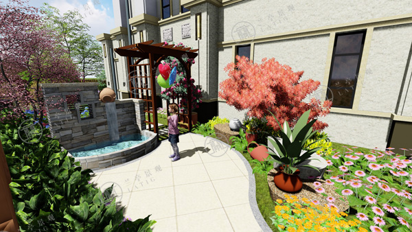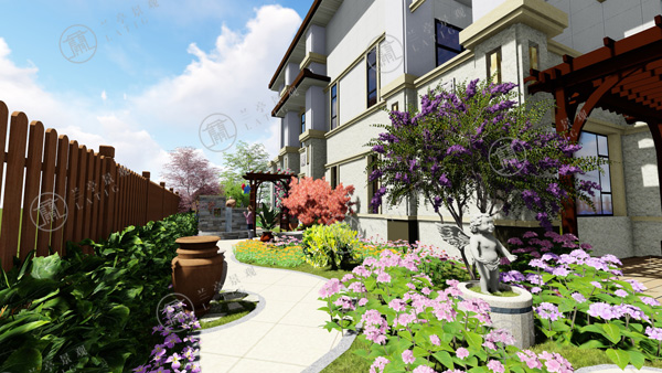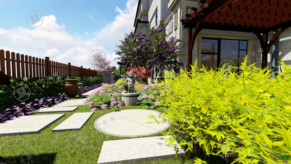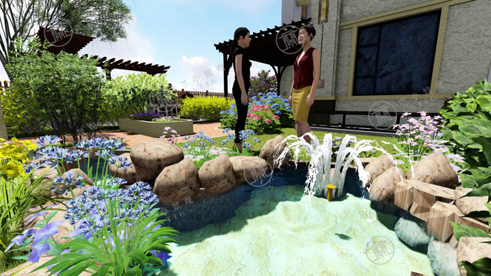 2.東方具有木氣,喜木喜水,宜布置水局。設(shè)計師在庭院的東南角布置一處自然水景,與花草結(jié)合,富有生氣。