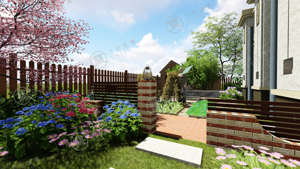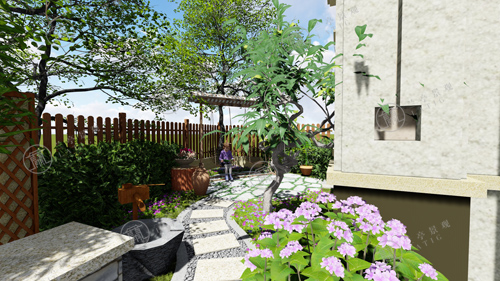 1.整個青島庭院設(shè)計分為入口水景、廊下休閑、花徑小路、田園菜地和秋千花園幾大部分。進(jìn)門處布置樹池,以解決庭院門與建筑門相沖的問題。