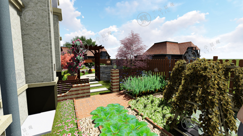 8.菜地通過荷蘭磚進(jìn)行分割和圍合,結(jié)合自然石子的鋪設(shè),塑造菜地更貼近自然的景觀效果。
