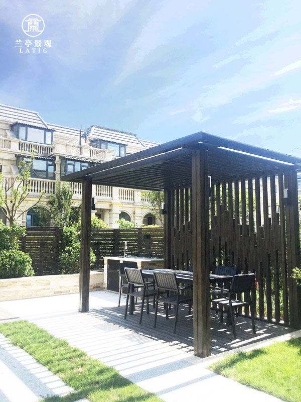 設計說明:整體設計上給人以清爽雅致之感,寬敞的布局讓人更加舒適。廊架及木格柵以簡約的造型為基礎,加上中式的荷花青石缸擺件,空間層次更加豐富,大而不空、厚而不重,凸顯庭院生活格調。