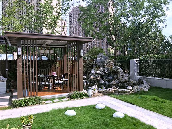 入戶看到是鏤空的格柵景墻,一支滴翠的造型松枝探過(guò)來(lái),瀟灑愜意,一條回家的三兩踏步,