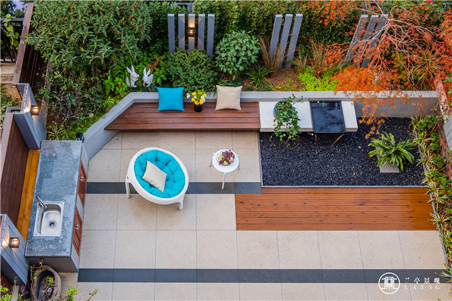 整個(gè)花園地面材質(zhì)注重簡約干凈,跳色鑲嵌芝麻黑讓地面鋪裝更有律動(dòng)感;同時(shí),臨近水景,材質(zhì)中融入木制元素,既柔化石材帶給人們的硬朗,又呼應(yīng)立面的木制景觀,給花園主人良好的花園體驗(yàn)和獨(dú)特的視覺感官。