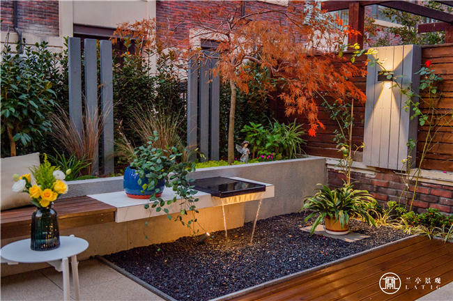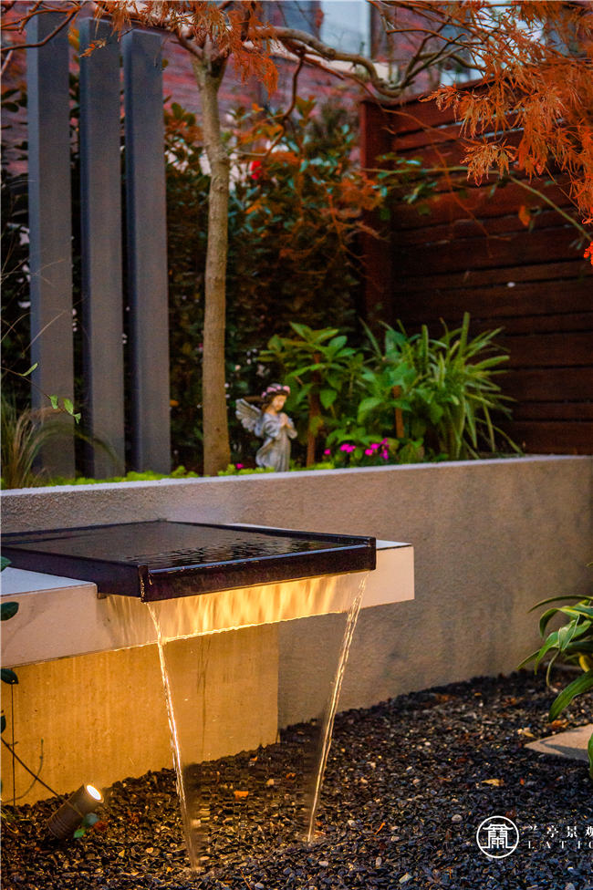 縱觀整個(gè)北花園,其空間功能相互咬合銜接,既是景觀空間,又是活動(dòng)休閑空間。推開門,搖曳的羽毛楓下,小天使靜靜的站在花叢中,伴隨著悅耳的流水聲,這美好的畫卷映入眼簾。