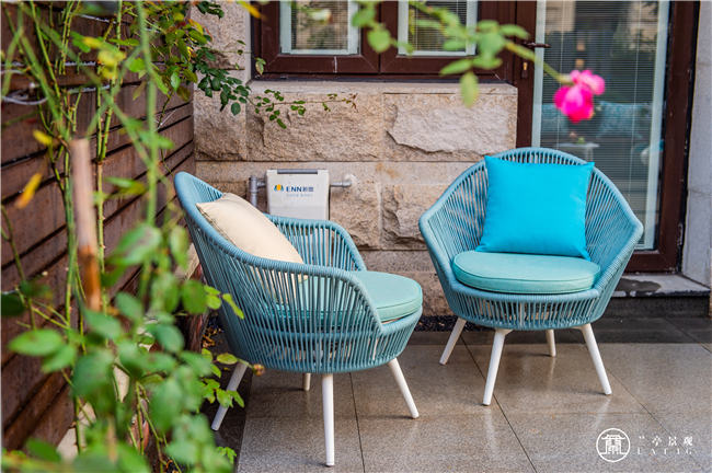 值得一提的是,小小花園里竟有兩個(gè)休閑空間。其一,拓寬出戶平臺(tái),置兩把戶外座椅,使之成為一個(gè)小的休閑空間,建筑上的挑檐恰是天然的戶外雨棚。晴天時(shí),看書、養(yǎng)花、曬太陽,盡享午后閑適時(shí)光;雨天時(shí),喝茶賞景好心情,雨中景色別樣美!