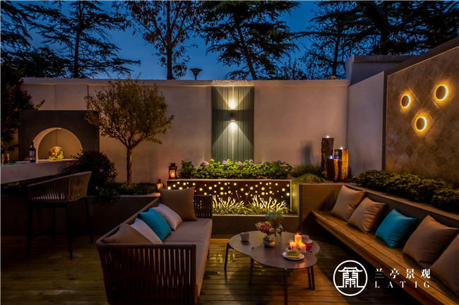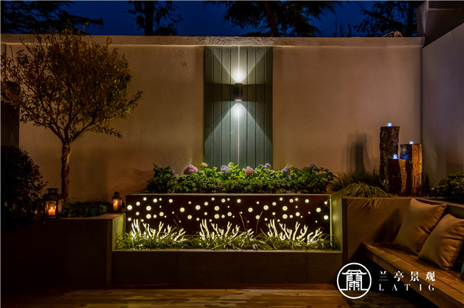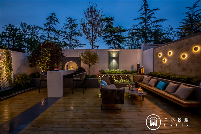 整個(gè)花園空間功能相互咬合銜接,既是過道入戶空間,活動(dòng)空間又是花園休閑空間。風(fēng)格上延續(xù)建筑風(fēng)格,并在設(shè)計(jì)材質(zhì)中融入美式元素,以簡約的大線條與鑲嵌體塊做設(shè)計(jì)布局,結(jié)合燈光的設(shè)計(jì)布置,給花園主人良好的花園體驗(yàn)和時(shí)尚的視覺感官。