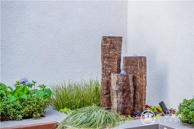 花園的休閑空間是一大亮點(diǎn),寒武石柱水景、層次花池、木質(zhì)坐凳,沙發(fā)休閑區(qū)完美結(jié)合。材質(zhì)上耐候鋼板的銹蝕形態(tài)和三岳流水小品(寓意細(xì)水長流,源源不斷)的自然形態(tài)形成呼應(yīng),美式風(fēng)格自然流露。相信,經(jīng)過時(shí)間的沉淀,小品呈現(xiàn)出的色彩和質(zhì)感,給花園增添獨(dú)特的藝術(shù)魅力。