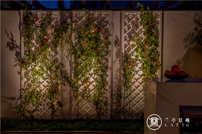 體現(xiàn)濃濃的美式風(fēng)格。一面花墻,淡淡的灰藍(lán)色木質(zhì)基調(diào),白色的網(wǎng)狀格柵顯得格外耀眼,薔薇歐月們正在鉚足勁兒的攀爬著…..