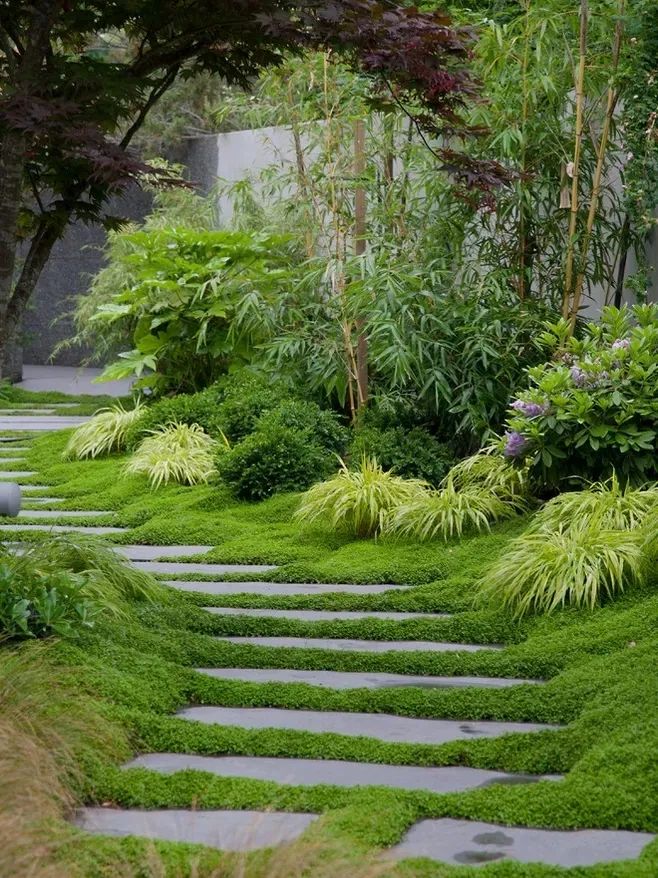 在狹長的空間中布置汀步,與草地自然的融為一體,整個(gè)空間看起來便不至于太擁擠。