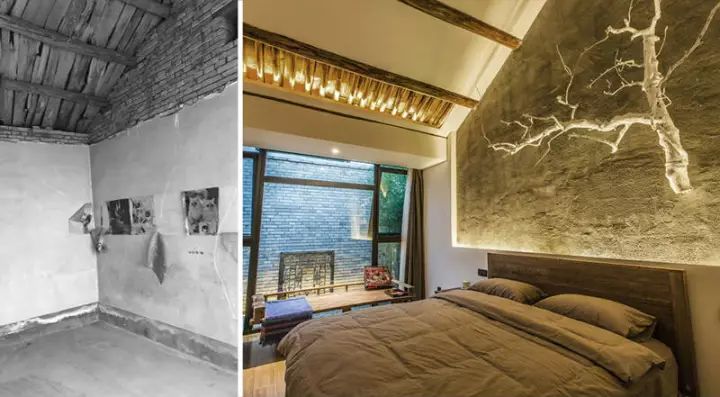 整個小院一共擁有兩間臥室,每一間都精心打造出完美的氛圍。這是其中一間主臥,素面朝天的床頭背景墻保留了原始粗糙的水泥質感,但設計師通過豐富的光影變化,和一截充滿禪意的枯樹枝來營造意境,最終形成別具一格的睡眠空間。青島花園設計公司——蘭亭景觀為您介紹。