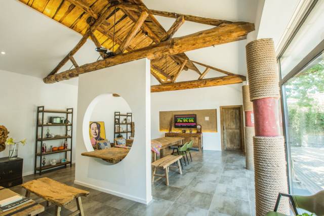 房間的頂部刻意保留了傳統(tǒng)的木梁結構,與現(xiàn)代簡約的大白墻混搭起來,碰撞出一種亦古亦今的美感。