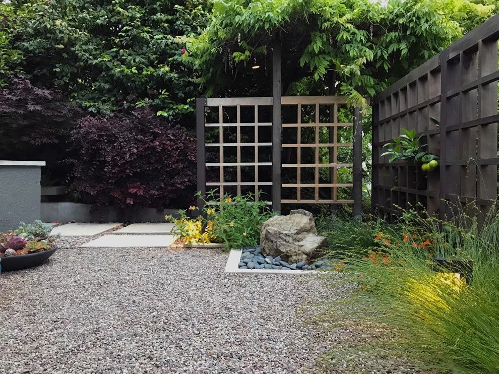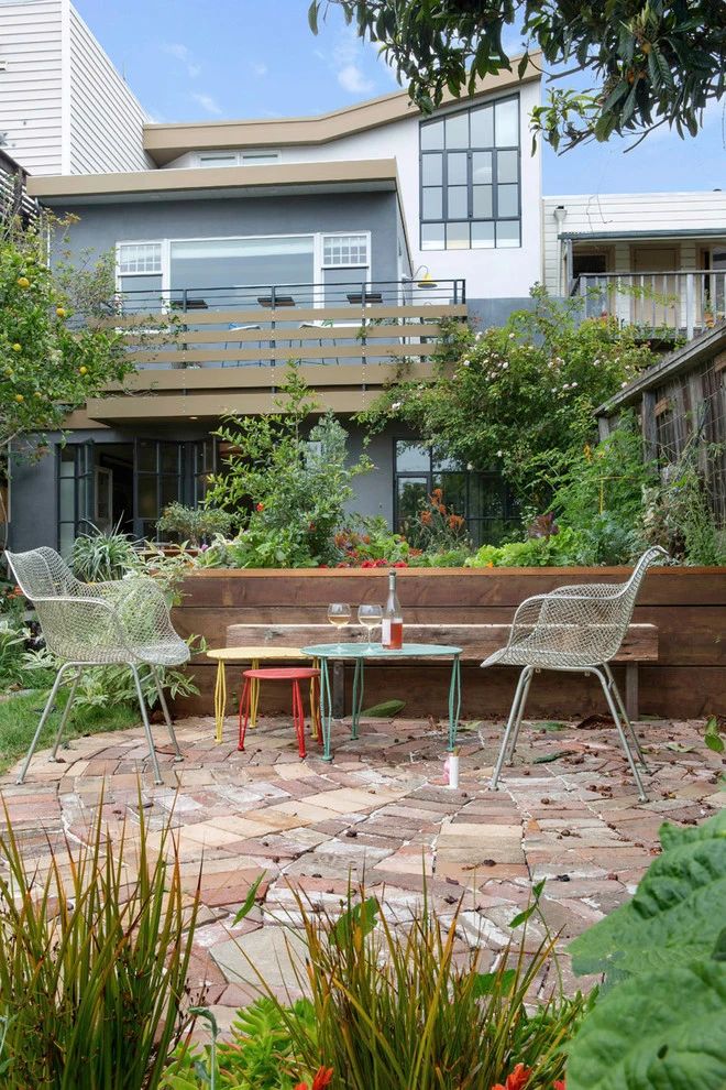 圖為加州一個前院花園,花園設(shè)計(jì)師伊恩為了節(jié)約建造成本,在休閑區(qū)和路徑上使用了預(yù)制水泥板塊和碎石,而不是造價相對高的石材,花園主可以在后期升級石材鋪裝。