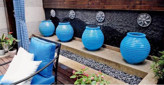 水景墻配合藍(lán)色的主題,4個(gè)翠藍(lán)色大陶罐置于墻體前方顯得尤為突出,與木質(zhì)平臺(tái)上的整套鐵藝椅形成完美的呼應(yīng)。煙臺(tái)別墅庭院設(shè)計(jì)