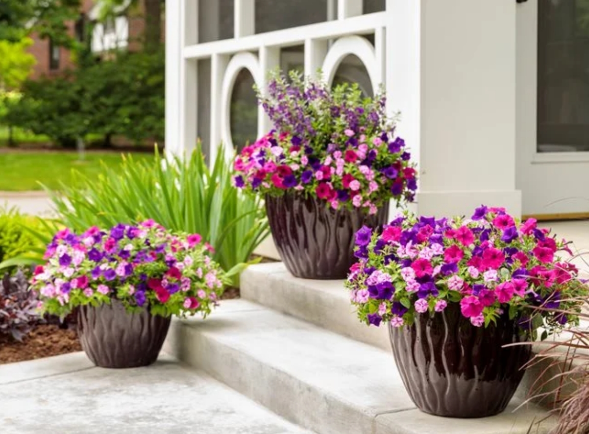 兩種色調(diào)的粉紅色和深紫色共同作用,在這個引人注目的容器展示中形成互補(bǔ)的對比。深色容器和中性背景營造出令人愉悅的平衡。青島別墅庭院設(shè)計