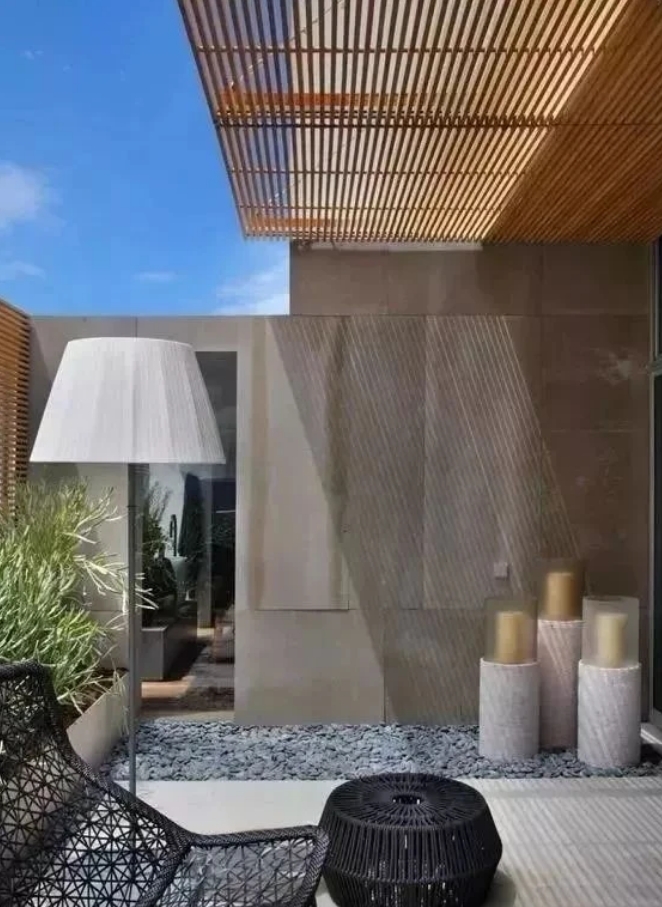 通過添加燈光、戶外地毯和藝術(shù)小擺件,讓庭院看起來像房間。當(dāng)室內(nèi)室外空間融為一體時,小院在視覺上自然就能顯得寬敞許多。濰坊庭院設(shè)計