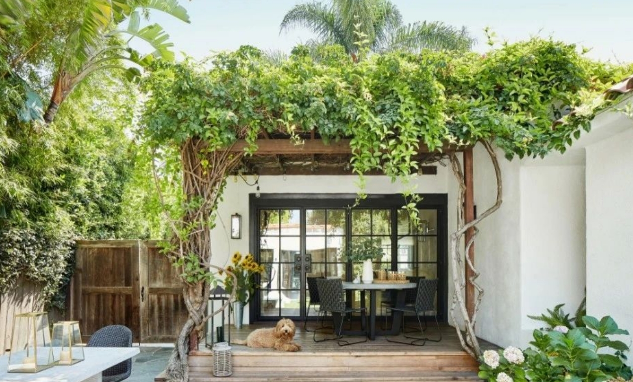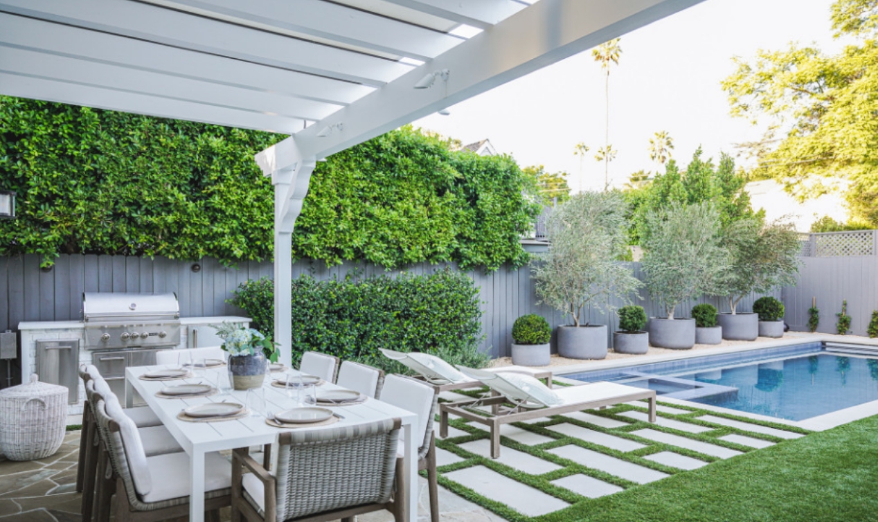 使用淺色的石材材料,例如鵝卵石,石板或白色石英石來強調(diào)花園區(qū)域。將背景墻壁刷成白色,或摻有白色菱形格子或其他樣式,同時也可以為葡萄藤、各種花藤提供支撐。