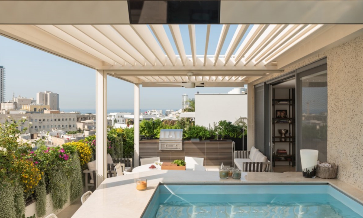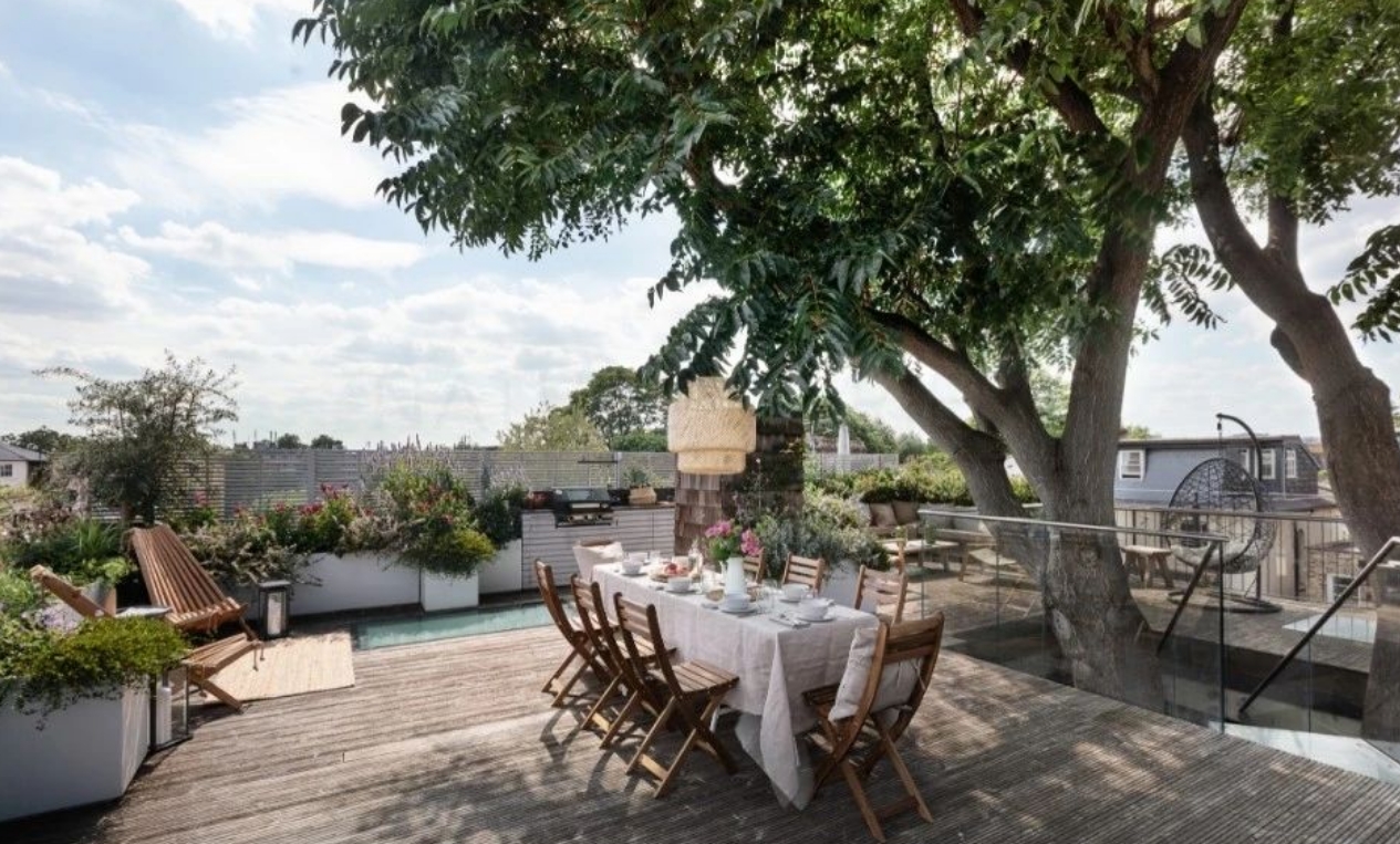 戶外餐吧:定制帶燒烤功能的島臺+伸縮雨棚,搭配長條木桌,雨天也能享受花園聚餐;