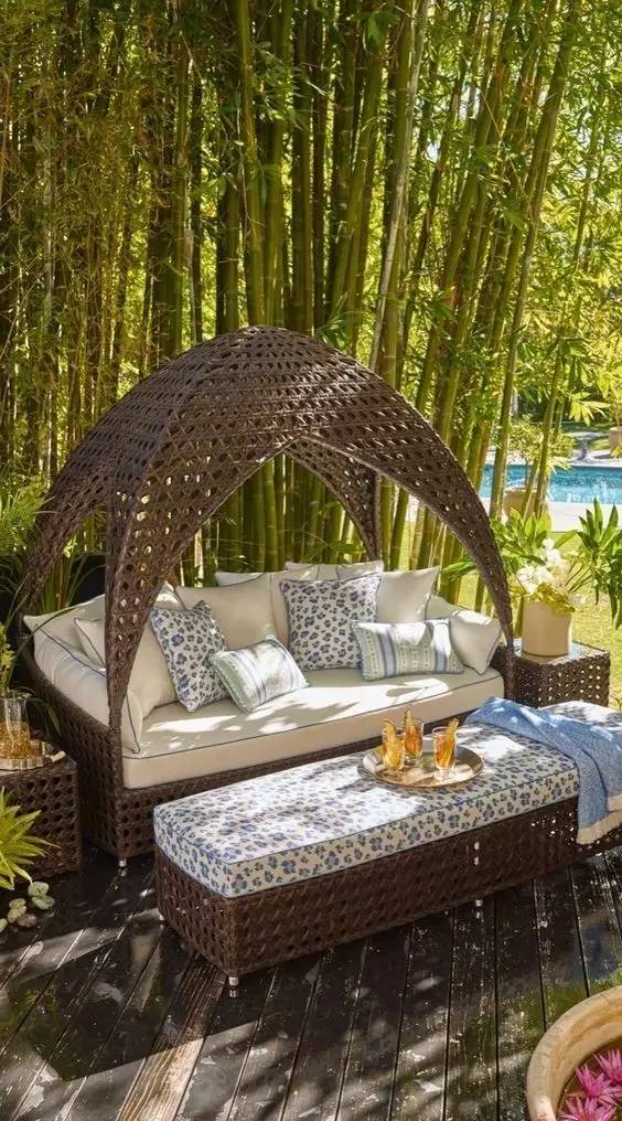 選擇什么樣的家具完全隨您心意,可能您的露臺(tái)并不需要太多的裝飾,但有一個(gè)坐臥兩用的沙發(fā)床絕對(duì)能滿足你所有的需求!一般來說,在沙發(fā)床的選擇上最好選擇帶有蔭蔽蓬的,自己另外安裝也不錯(cuò),這樣才會(huì)帶給您最好的午睡或閱讀體驗(yàn)。