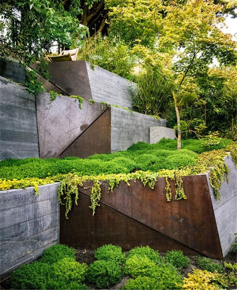 如擋土墻與道路或廣場(chǎng)、建筑物距離較近,可以在在擋土墻表面刷迷彩墻漆并于擋土墻前種植枝葉較密的攀爬植物,這樣在植物未長(zhǎng)成之前墻漆就可以起到柔化擋土墻觀(guān)感的作用。青島庭院設(shè)計(jì)