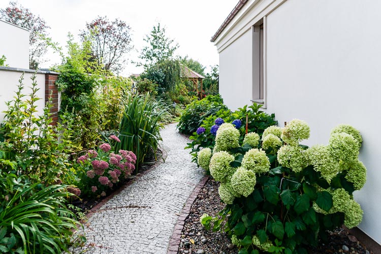 如果你特別喜歡種植花草的話,可以在進(jìn)行私家別墅花園設(shè)計(jì)時(shí)采用這樣的方式。別墅花園的側(cè)面只一條簡(jiǎn)單的小徑,將其一分為二,邊上種植上翠綠蘢蔥的各色植物,尤其是這繡球可愛極了。
