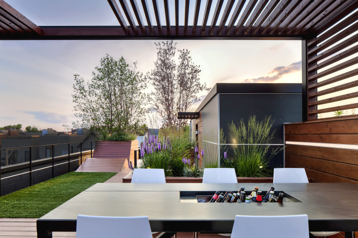 定制的LED燈條水平安裝在墻上,為一個(gè)藝術(shù)和動(dòng)感的夜晚場(chǎng)景。人造草坪為娛樂(lè)提供了豐富的空間,并與耐旱植物進(jìn)行了鮮明對(duì)比,因?yàn)樗鼈冊(cè)诔鞘形蓓敿装逦夂蛑凶聣殉砷L(zhǎng)。