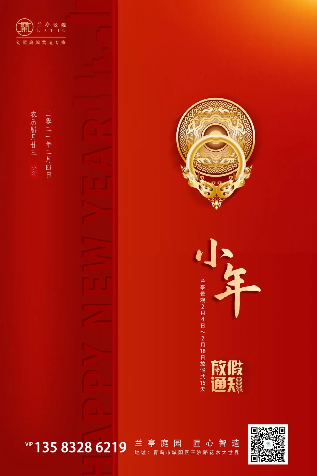 【蘭亭景觀】小年納福,春節(jié)放假通知! 來源:蘭亭景觀庭院設計 點擊次數:4713 發(fā)布時間:2021/2/3 11:59:08 結合公司實際情況與工作安排,蘭亭景觀春節(jié)放假安排如下:2月4日至2月18日放假,共15天。2月19日正式上班。
